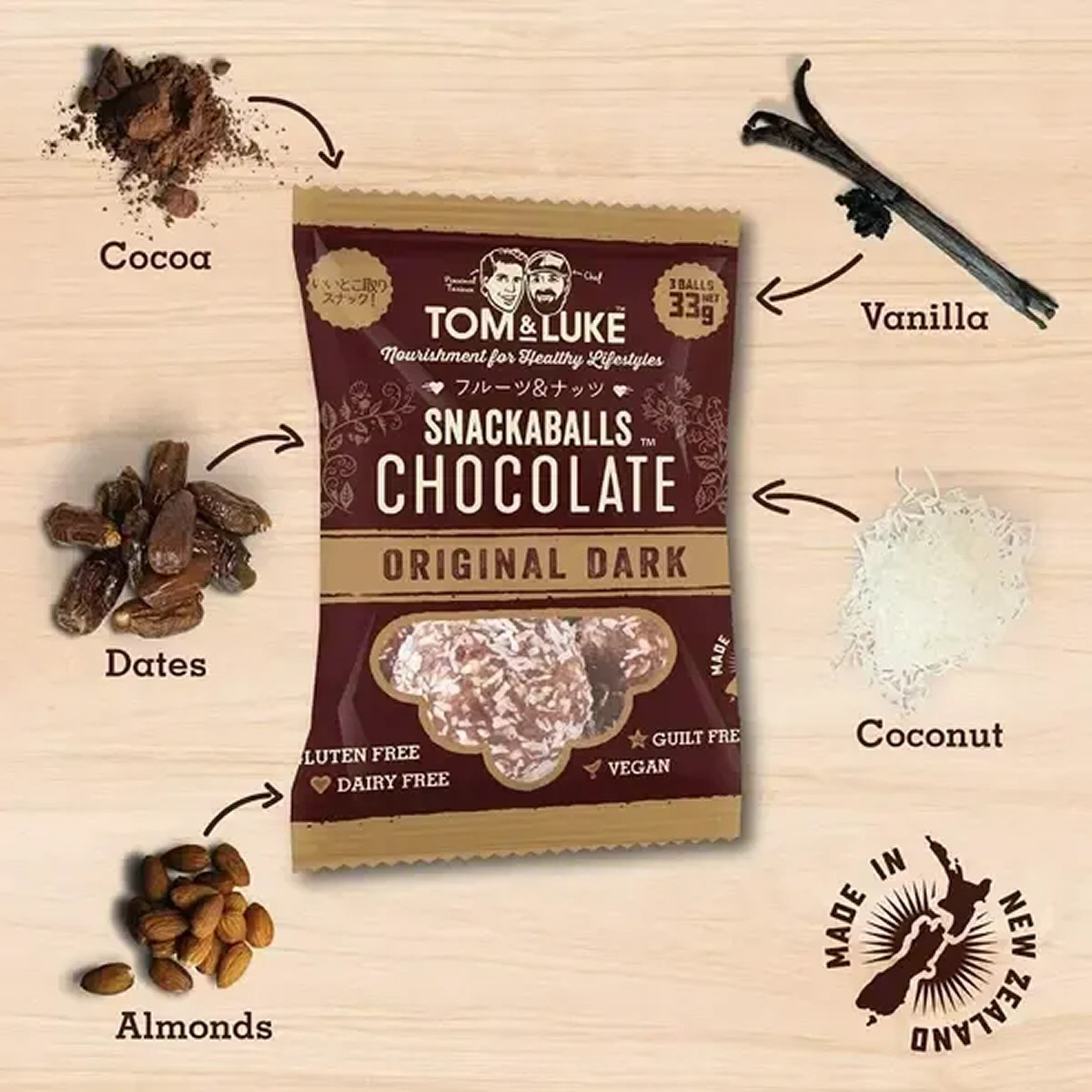 デーツ、カカオ固形分(カカオマス、ココアパウダー)、アーモンド、ココナッツ、塩/香料(バニラ)